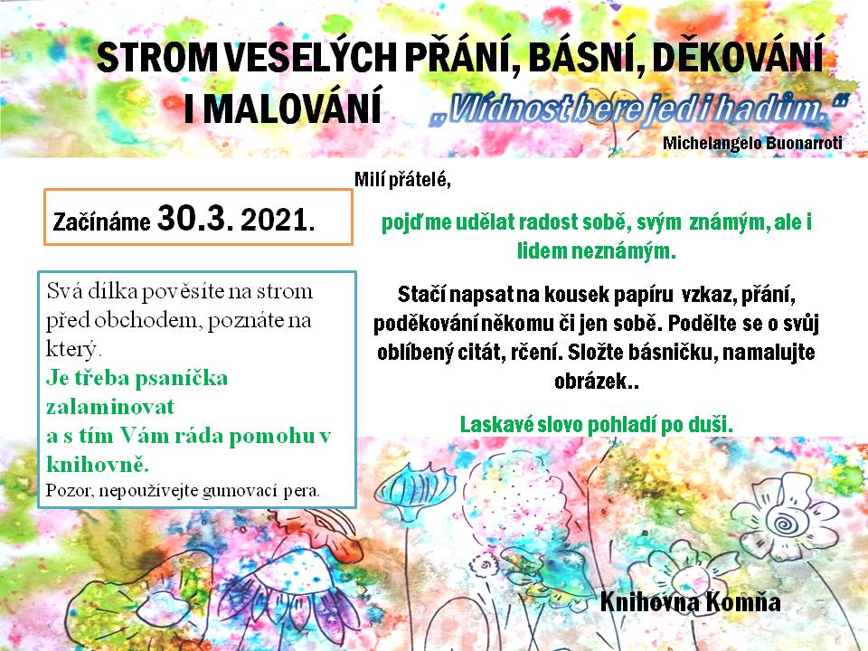 Od 30. března budete mít tu možnost. Co pro to udělat? Jenom maličkost, vezměte kousek papíru, na něj napište, namalujte vzkaz, přání, poděkování, básničku, citát, rčení..... a pověste ho na strom před obchodem. Strom dobře poznáte. Vám to mnoho času nezabere, ale jinému může rozsvítit celý den.